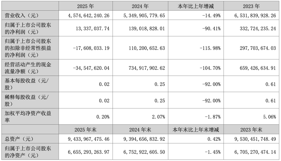 丰林集团(601996)发布2025年年报,公司实现营业总收入16.97亿元,同比下降16.00%,归母净利润-1.28亿,亏损同比扩大7.09%。