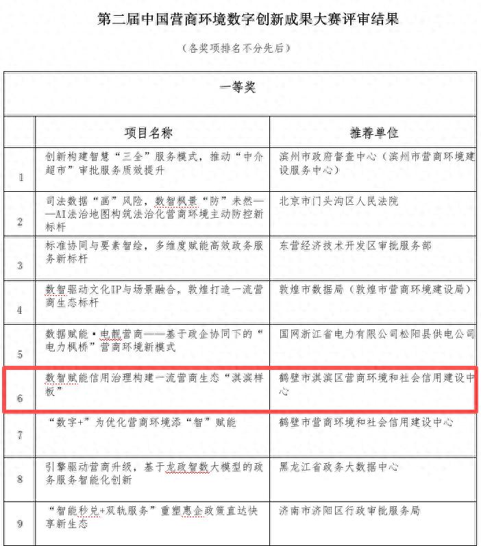 近日,第二届中国营商环境数字创新成果大赛评审结果揭晓,鹤壁市淇滨区报送的《数智赋能信用治理 构建一流营商生态“淇滨样板”》项目,凭借独具特色的创新实践与显著成效,从全国海量参赛项目中脱颖而出,荣获一等奖,标志着淇滨区数字赋能信用治理、优化营商环境的工作成果,获得国家级权威认可。
