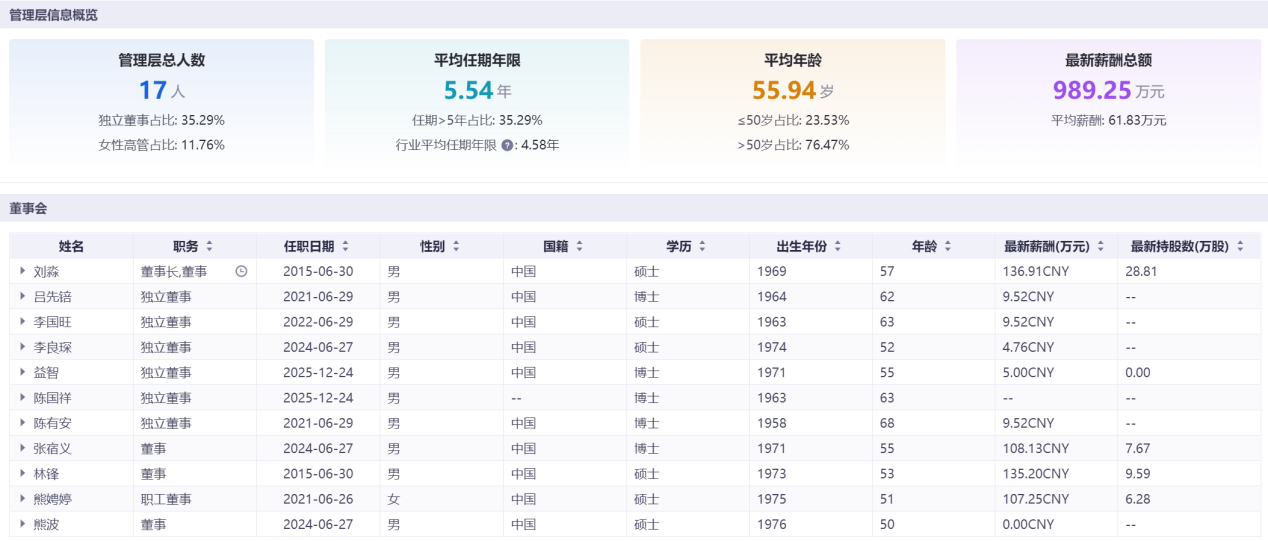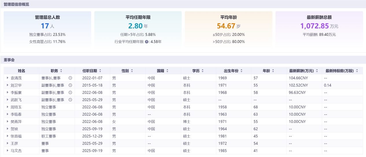 公司财务总监与董事会秘书长期稳定,董秘2009年至2026年仅更换2任,核心团队任期远超行业平均水平,管理层平均任期达8.55年,为五家企业中最高。