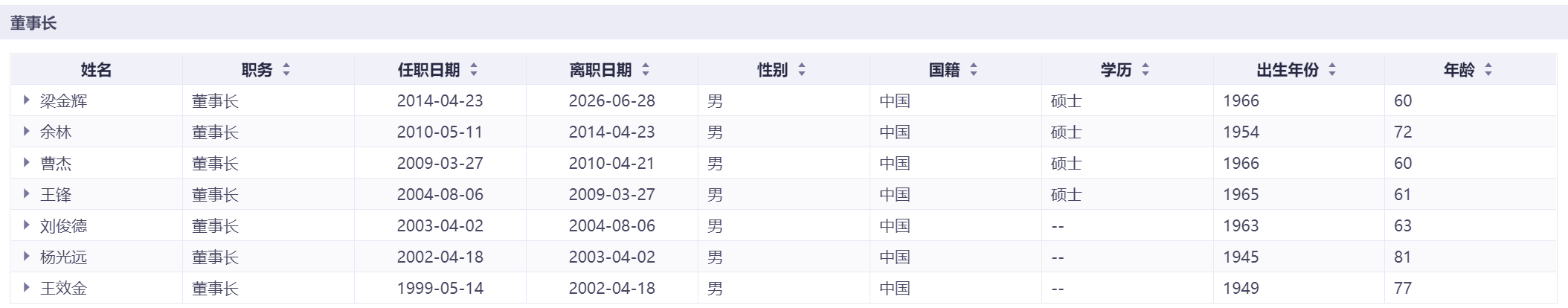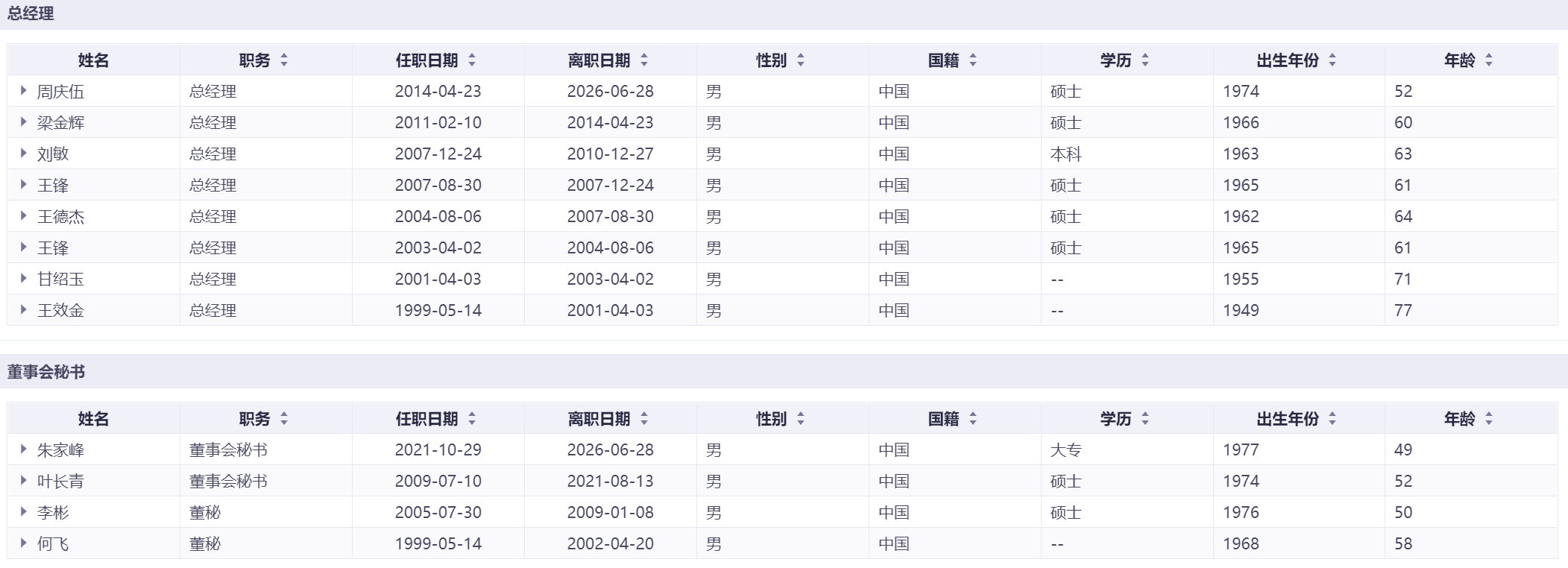 泸州老窖1999年至2026年董事长更迭3任,2015年刘淼上任至今已稳定履职近10年;总经理同期更换3任,2015年林锋上任后与董事长长期搭档。