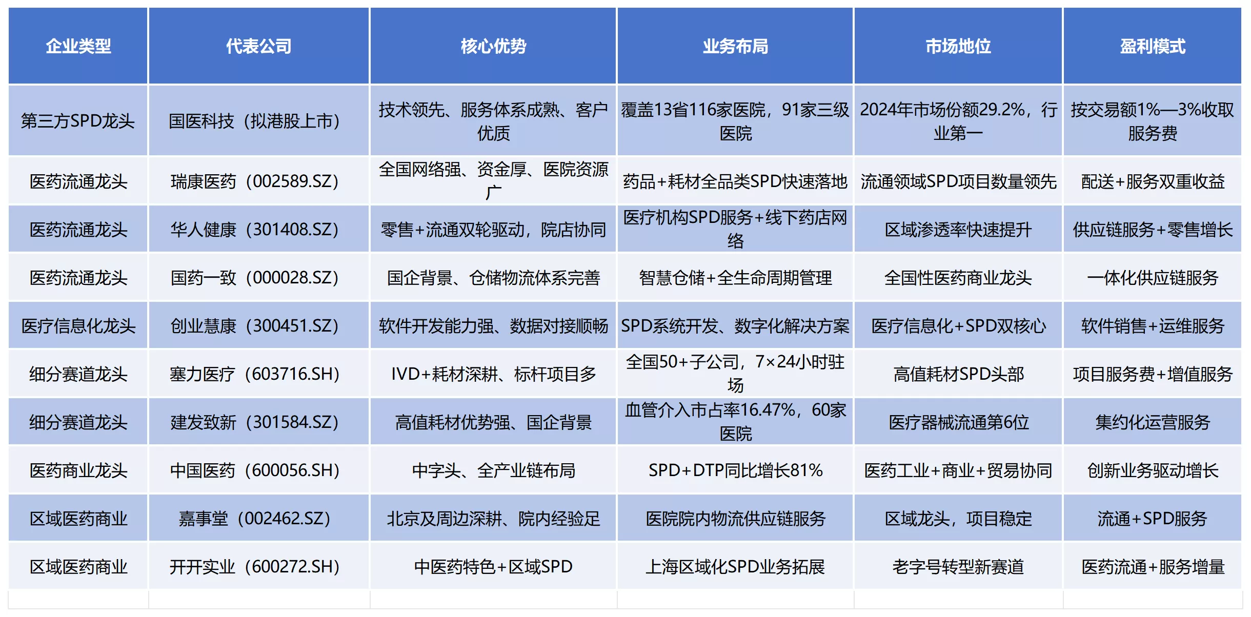 SPD万亿赛道吸引三类主力玩家:第三方专业服务商、医药流通巨头、医疗信息化企业。各方资源禀赋不同,形成清晰的竞争格局。