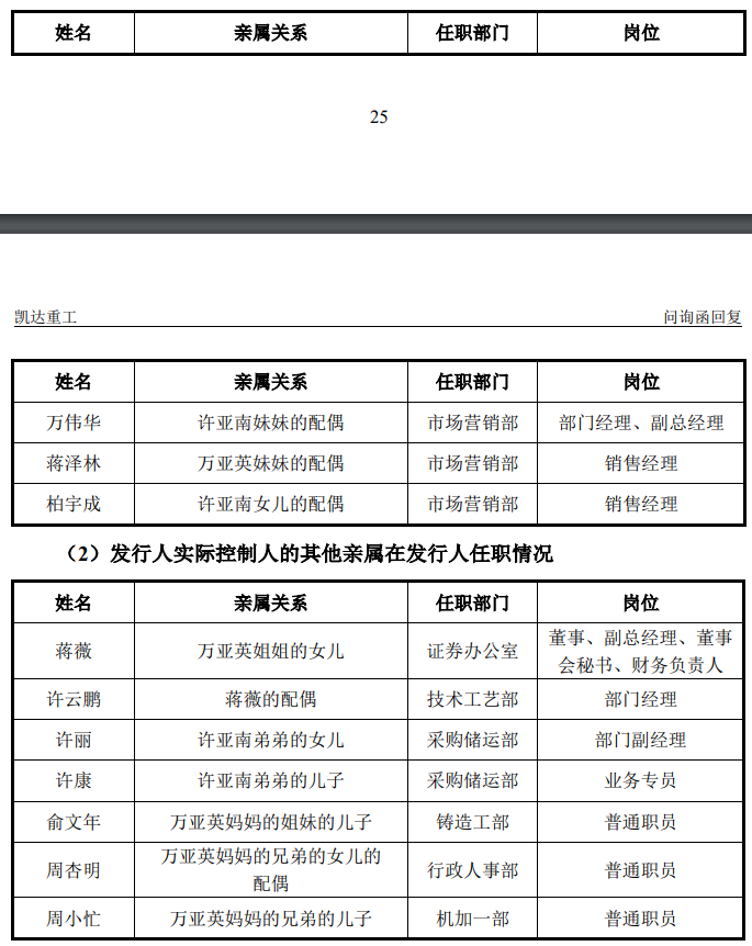 可以看出,整个凯达重工几乎由“亲属团”打理,技术、采购、人事、证券、营销等部门均是实控人夫妇的家人。