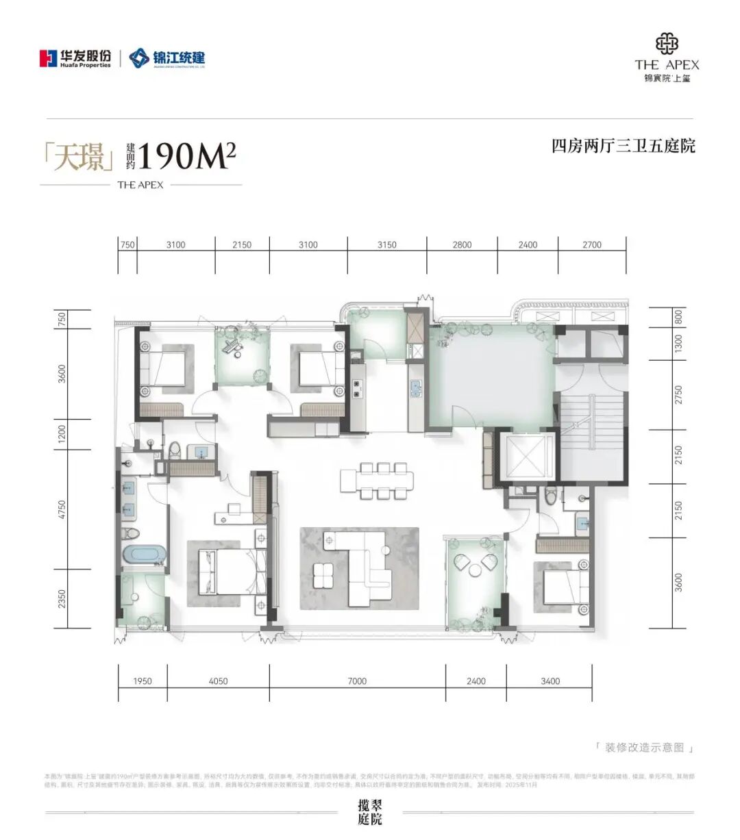 建面约190㎡户型,竟然做到了5个庭院!从进门处超20㎡的入户光厅,到客厅里的庭院,到独立生活阳台,再到主卧的独立庭院、两次卧之间的连通庭院等等。