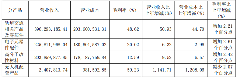 从营收分布来看,轨道交通相关产品及零部件、电子元器件配件、高分子改性材料三大业务共同构成了祥和实业的营收“底座”。根据财报内容,报告期内三大业务分别实现营收3.96亿元、2.26亿元、2.04亿元,分别同比增长50.93%、6.32%、9.52%。