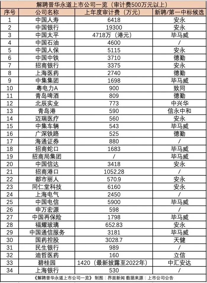 2023年解聘普华永道部分上市公司一览,图源:界面新闻