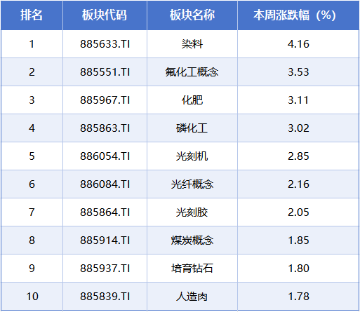 板块方面,本周涨幅居前的概念板块分别是染料、氟化工概念、化肥、磷化工、光刻机,累计涨幅分别为4.16%、3.53%、3.11%、3.02%、2.85%。