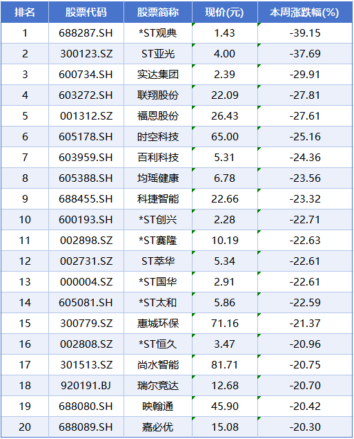 本周个股跌幅榜前五位分别是*ST观典、ST亚光、实达集团、联翔股份、福恩股份,累计跌幅分别为39.15%、37.69%、29.91%、27.81%、27.61%。