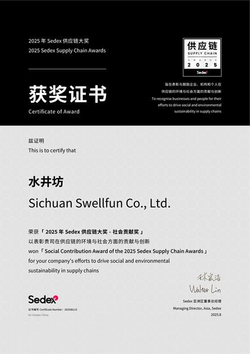 立足产业链协同发展,水井坊将ESG评价嵌入供应商准入与管理体系,并依托 Sedex工具对关键供应商开展社会责任评估。同时,公司联合国内龙头企业共同发起“供应链ESG管理倡议(SCSI)”,并深度参与行业标准制定,推动ESG从企业内部管理延伸至全价值链协同。凭借在相关领域的卓越实践,水井坊于2025年荣获Sedex供应链大奖“社会贡献奖”,成为全球唯一获此殊荣的白酒企业。