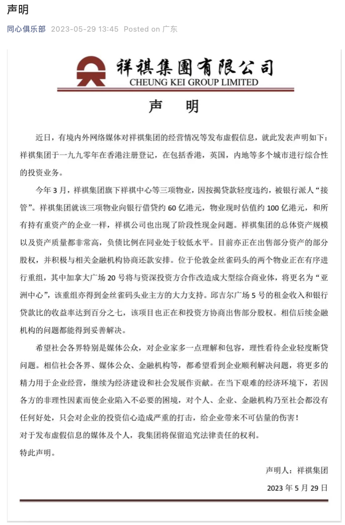 5月29日,同心俱乐部官微消息,祥祺集团发布声明称,今年3月,祥祺集团旗下祥祺中心等三项物业,因按揭贷款轻度违约,被银行派人“接管”。