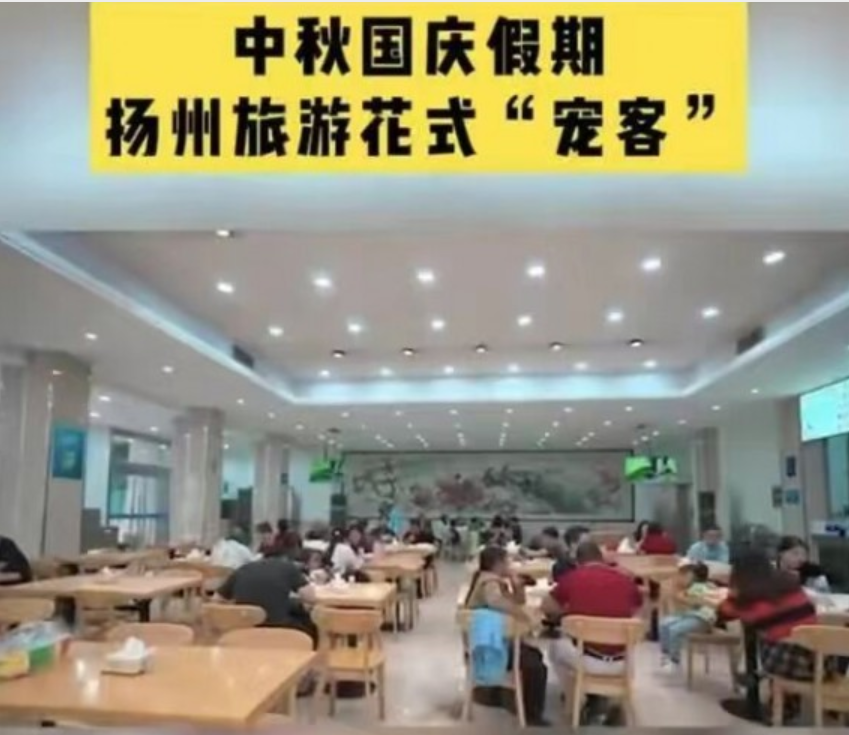就在这个时候,扬州市政府食堂提供游客餐,并推出免费开放停车场等举措,不仅解决了旅游期间资源紧缺的问题,受到游客热捧,还意料之外地成为了新“打卡景点”。