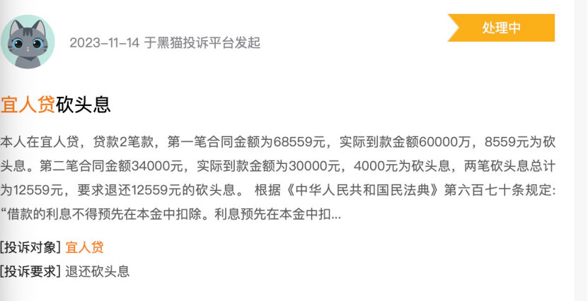 2023年11月14日,有消费者投诉称在宜人贷贷款2笔,均遭到了砍头息。其中,第一笔合同金额为68559元,实际到款金额60000万,8559元为砍头息。第二笔合同金额34000元,实际到款金额为30000元,4000元为砍头息,两笔砍头息总计为12559元,要求退还12559元的砍头息。
