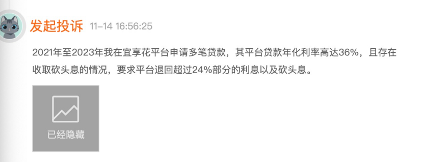 2023年11月14日,有用户投诉称在宜享花平台申请多笔贷款,其平台贷款年化利率高达36%,且存在收取砍头息的情况,要求平台退回超过24%部分的利息以及砍头息。