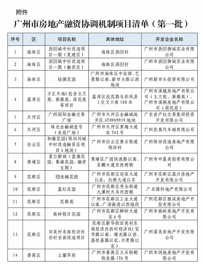 2月8日,广州市房地产融资协调工作小组办公室发布关于推送市房地产融资协调机制项目清单(第一批)的通知。通知要求,各金融机构与房地产开发企业积极对接、平等协商,按照市场化法治化原则评估名单内项目,自主决策和实施,对于条件充分的房地产项目推动尽快落地放款,并配合相关部门及时跟踪项目贷款落实情况,充分发挥示范项目作用,以典型案例带动协调机制落深落实,共同推动金融与房地产良性循环,促进我市房地产市场平稳健康发展。
