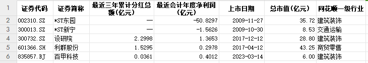 既破发又破净的公司有5家,分别是*ST东园、*ST新宁、设研院、利群股份、百甲科技,而且*ST东园、*ST新宁最近三年累计分红为零。从同花顺行业分类上看,建筑装饰活成了最惨的那个“仔”。