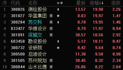 除了深城交、勘设股份外,包括苏交科、测绘股份、设研院等企业在工程咨询服务领域也具备极强的竞争力,上述公司的股价今日也实现了大涨。
