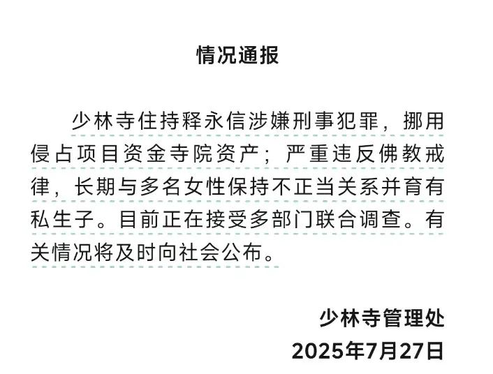7月27日晚,少林寺官方通报,住持释永信因涉嫌刑事犯罪、违反佛教戒律,正接受多部门联合调查。消息一经发布,迅速掀起舆论风暴,将这位“佛门CEO”和少林寺的商业版图推至风口浪尖。