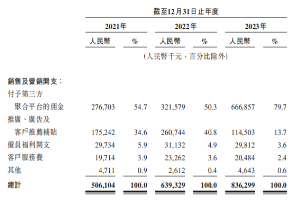 证券之星注意到,聚合平台带来的不只是用户流量,也让曹操出行的成本大增。数据显示,曹操出行的销售及营销开支由2021年的5.06亿元增长至2023年的8.36亿元。其中,各报告期付予第三方聚合平台的佣金分别为2.77亿元、3.22亿元、6.67亿元,各期占比分别为54.7%、50.3%、79.7%。
