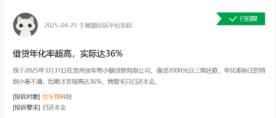 然而,信贷业务也使满帮陷入高息贷风波。有司机在黑猫投诉上称,于2025年3月31日在货车帮小贷借贷2000元分三期还款,年化率标注的特别小看不清,后期才发现高达36%,要求只归还本金。