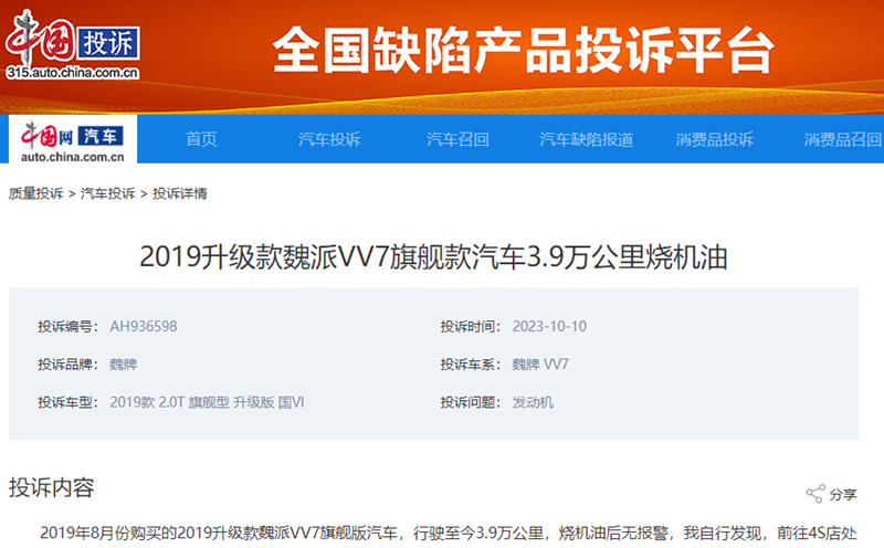 值得注意的是,记者查询发现,在中国投诉-全国缺陷产品投诉平台及其他投诉平台,魏牌 VV7“烧机油”问题并非个例。无独有偶,中国投诉-全国缺陷产品投诉平台更早时候也接到另一位VV7车主的投诉,其反映车辆全程4S保养,发动机却出现严重“烧机油”,机油已经低于下限,且会引发变速箱严重顿挫等问题,给日常的用车带来了很大困扰。