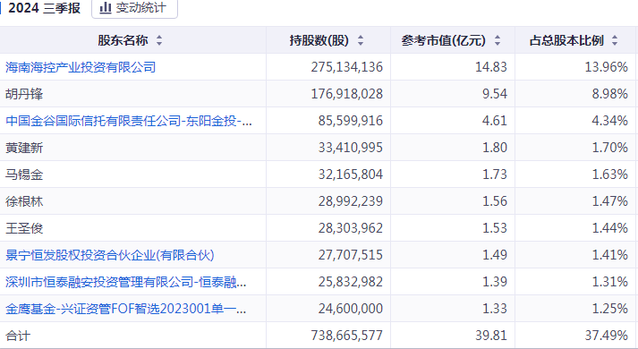 2024年7月,相关过户登记手续办理完毕。本次股份转让完成后,海控产投直接持有上市公司275,134,136股股份,占公司股份总数的13.96%,成为公司第一大股东。公司控股股东变更为海控产投,实际控制人变更为海南省国有资产监督管理委员会。
