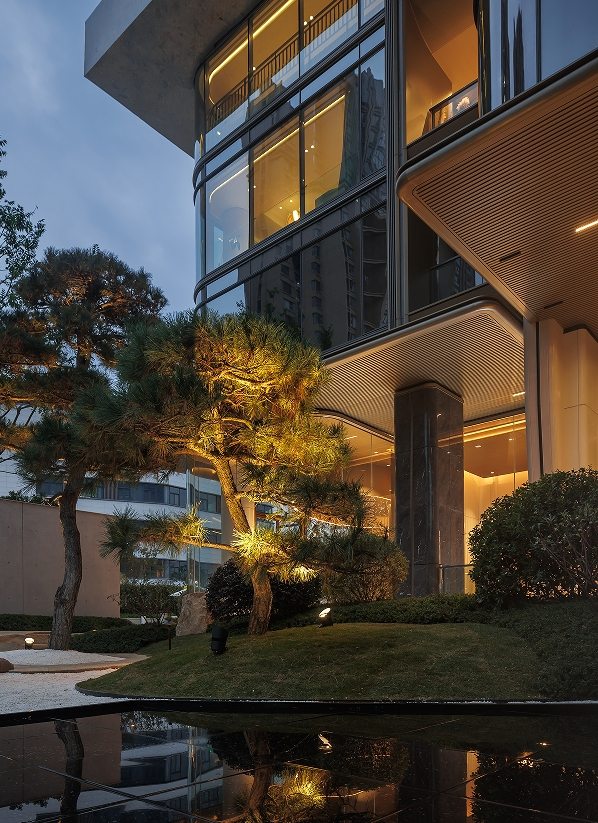 相信很多人都会被项目入口处独特的艺术审美惊艳。项目大胆运用清水混凝土浇筑春天艺术馆,这种看似冒险的质朴材质,与静水、白沙、31棵泰山松以及纯手工錾凿的柏坡黄景石及乌桕林形成精妙呼应,营造出独特的东方禅境。