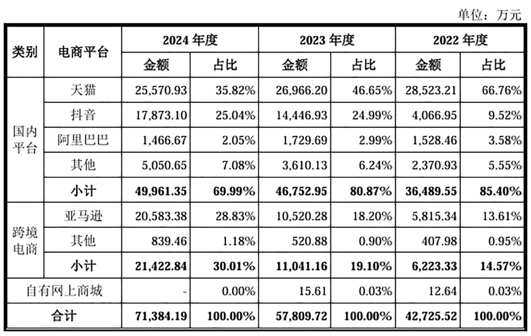 近几年来,太力科技营收增长迅速,很大程度得益于抖音电商和亚马逊销售增加。太力科技在2020年布局抖音电商,到2024年销售收入增长至1.79亿元;自2019年布局跨境电商业务,2024年亚马逊平台销售收入达到2.06亿元。