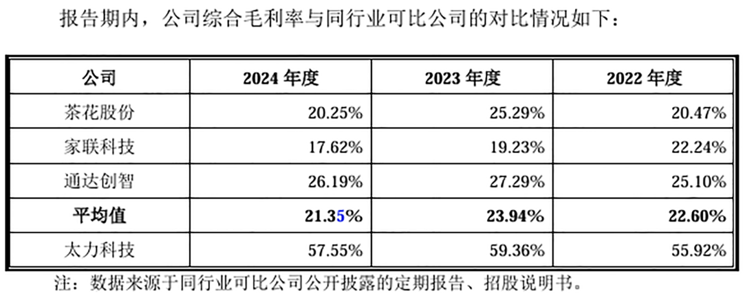 另一方面,通过线上直销模式,太力科技减少经销商等中间环节,毛利率大幅高于同行。2024年,其毛利率为57.05%,高于同行业可比公司的毛利率平均值21.35%。但是,这种模式也导致期间费用高企。