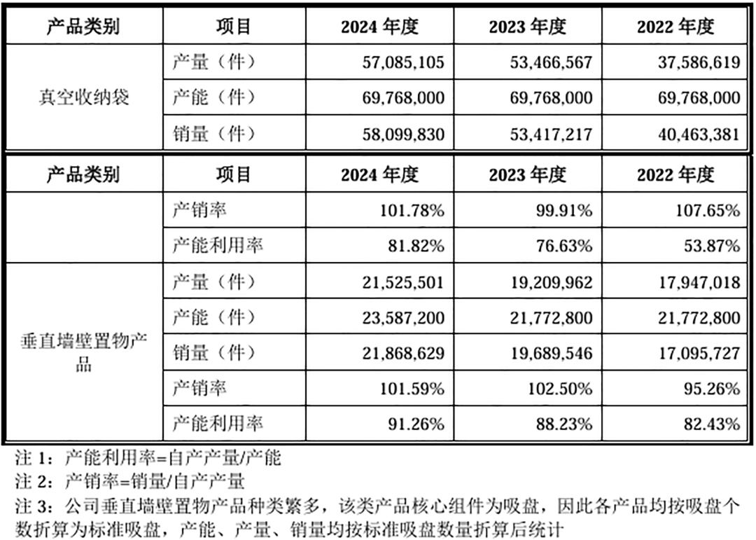 不过,从产能利用率来看,太力科技的主要产品产能利用率还有提升空间。2024年,真空收纳袋产能利用率为81.82%,垂直墙壁置物产品产能利用率为91.26%。