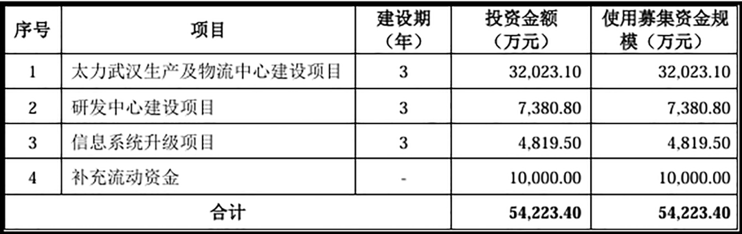 本次上市,太力科技募集资金主要投资3大项目,分别为太力武汉生产及物流中心建设项目、研发中心建设项目和信息系统升级项目,以及补充流动资金。其中,太力武汉生产及物流中心建设项目投资3.20亿元。
