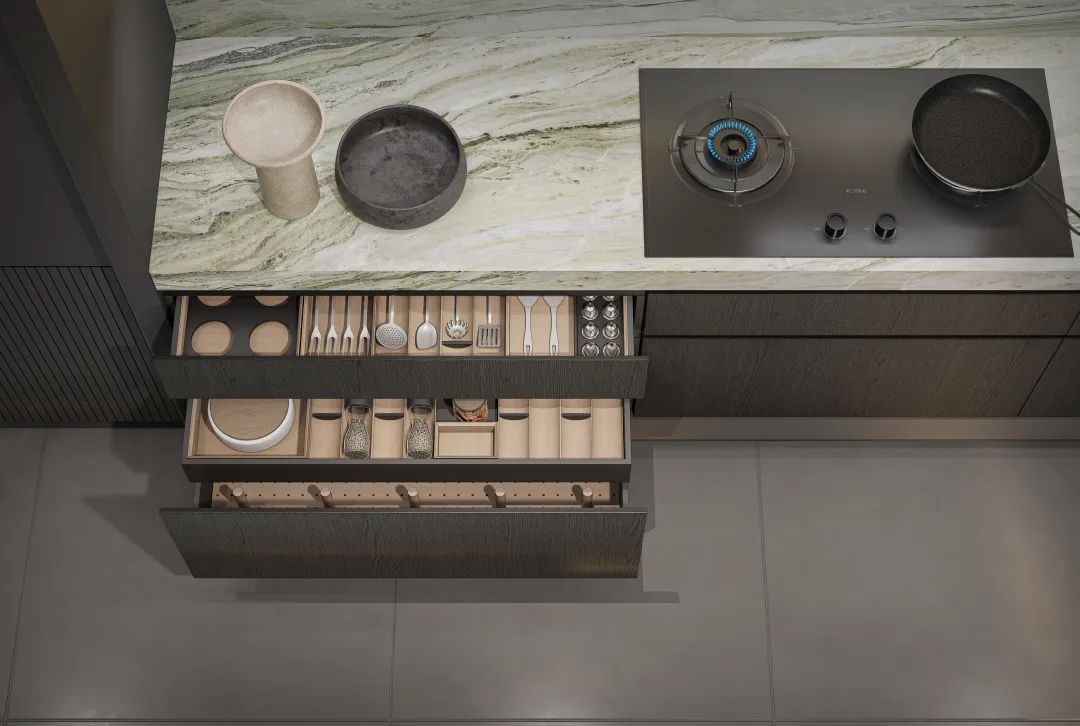 其中,让家居新范式印象最为深刻的设计是,洞庭系列的“六合纹”,以金色线条勾勒六边形图腾,融合东方文化中“天地四方”的宇宙和谐观、西方神圣几何学中的平衡理念,似自然界中的蜂巢/雪花/龟甲,象征效率、稳定与和谐,传递出对美好生活的祝福。另外,洞庭系列还在大型家电“隐身术”、茶台设计的闭合、双厨空间的透明屏、衣柜与衣帽间引入隐形全天候消杀系统等方面体现设计的巧思,充分将产品功能、空间视觉、情感美学融为一体,让消费者舒适自然地享受到设计带来的幸福生活。