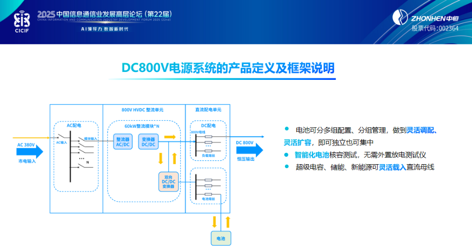 李善策先生进一步阐述了DC800V电源系统的产品定义及框架。该电源系统具备电池多组配置与分组管理功能,能够实现灵活调配和扩容,既可以独立运行,也可以集中管理。此外,系统还支持智能化电池核容测试,无需外置放电测试仪,同时可灵活载入超级电容、储能和新能源至直流母线。