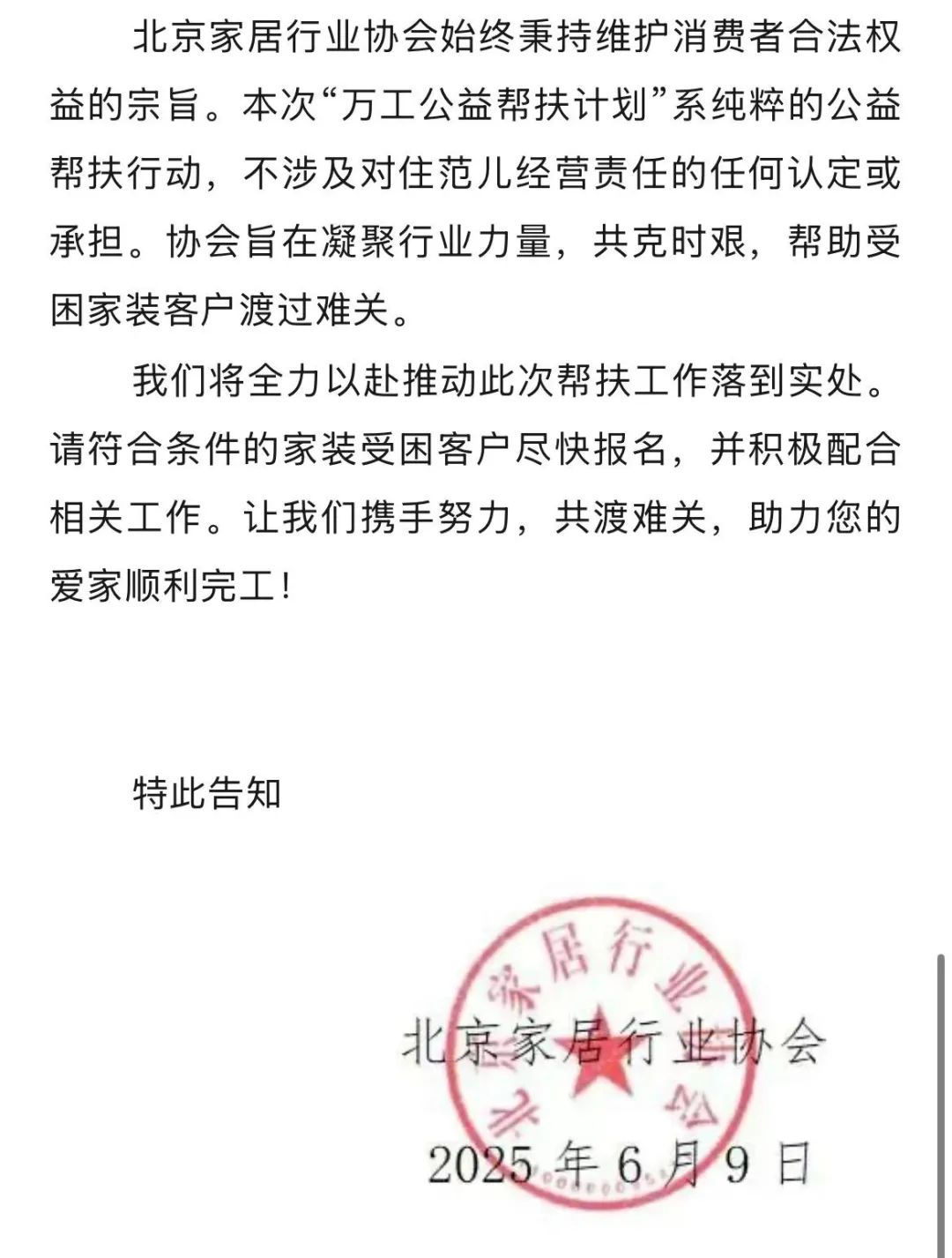 事件的最新转折出现在6月9日。当天,北京家居行业协会发布北京地区“住范儿事件”家装受困客户专项公益帮扶公告表示,协会将联合北京8家家装企业,正式启动“万工公益帮扶计划”,为家装受困客户,免费提供剩余基础施工用工支持。