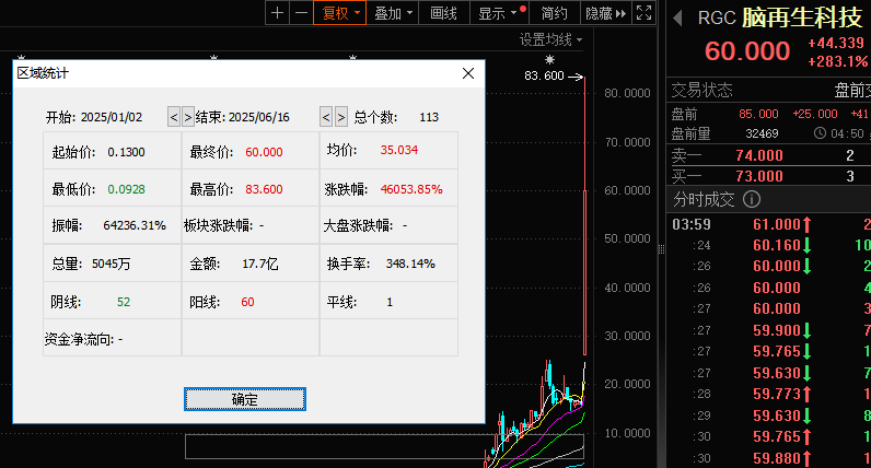6月16日,在美上市的中概股公司脑再生科技(RGC.US)股价暴涨283%,盘中多次熔断,收报60美元,创下历史新高,总市值突破296亿美元,该股年内累计涨超460倍。 其大涨带动了17日,A股和H股的脑机接口概念股的全线飙升。
