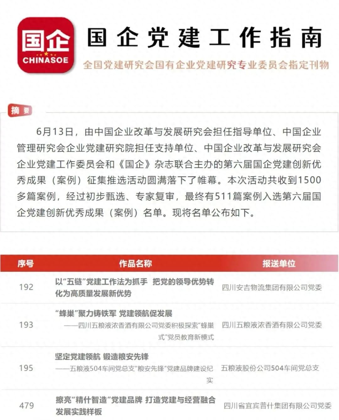 6月13日,由中国企业改革与发展研究会指导、中国企业管理研究会企业党建研究院支持、中国企业改革与发展研究会企业党建工作委员会和《国企》杂志联合主办的第六届国企党建创新优秀成果(案例)名单发布,五粮液集团公司党委4个直属党组织普什集团党委、安吉集团党委、浓香酒公司党委、504车间党总支的党建案例成功入选,入选案例数量位居行业第一、全省第一。
