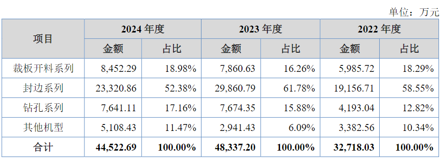 从产品销售比重来看,2024年,豪德数控的封边系列产品销售收入占比为52.38%,为公司主要收入来源;裁板开料系列、钻孔系列及其他系列产品,销售收入占比分别为18.98%、17.16%和11.47%。