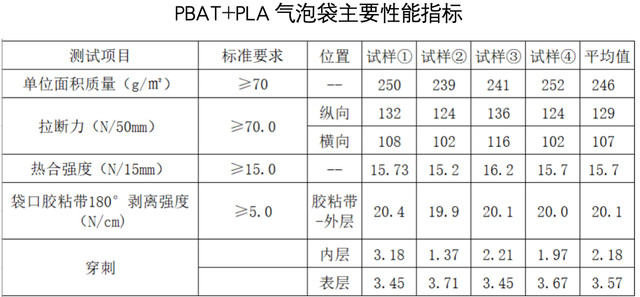 另一款产品PBAT(聚己二酸/对苯二甲酸丁二酯)与PLA(聚乳酸)共混的气泡袋,虽然其抗拉断力性能达标,但单位面积质量达到246g/m2,在包装减量化方面处于劣势;而且其耐穿刺性能偏低,难以承载重物或异形件,限制了其使用范围。