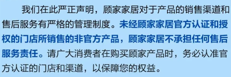 其中,左右沙发在公告中就直白表明:“未经左右沙发官方认证和授权的门店所销售的非官方产品,左右沙发均不承担其质量保证及售后服务责任。”顾家家居和永艺股份也明确表示,对于非官方授权渠道销售的产品将不提供任何售后服务。