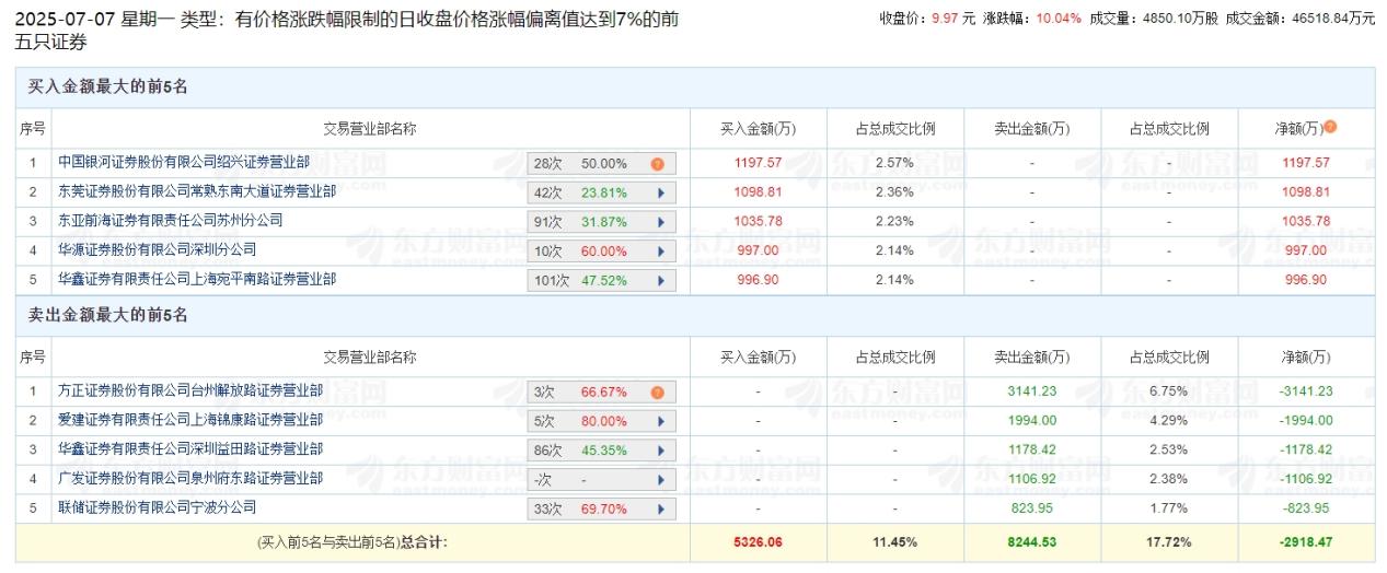 7月7日,因有价格涨跌幅限制的日收盘价格涨幅偏离值达到7%而登上龙虎榜。