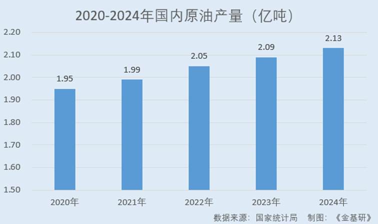 据国家统计局数据,2020-2024年,国内原油产量分别为1.95亿吨、1.99亿吨、2.05亿吨、2.09亿吨、2.13亿吨。