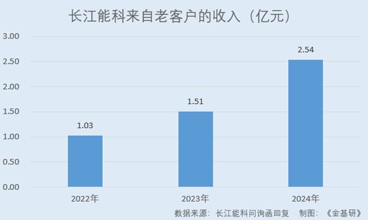 据长江能科问询函回复,2022-2024年,长江能科主营业务收入中来自老客户的收入分别为1.03亿元、1.51亿元、2.54亿元,占比分别为47.34%、44.01%、81.49%。