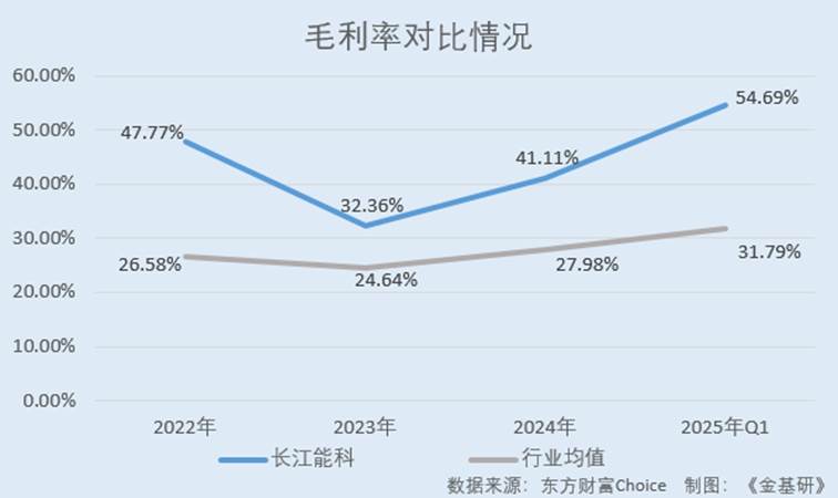 据东方财富Choice数据,2022-2024年及2025年1-3月,长江能科的毛利率分别为47.77%、32.36%、41.11%、54.69%。同期,长江能科招股书中五家同行业可比公司的毛利率均值分别为26.58%、24.64%、27.98%、31.79%。