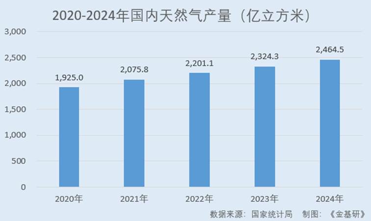 同期,国内天然气产量分别为1,925.0亿立方米、2,075.8亿立方米、2,201.1亿立方米、2,324.3亿立方米、2,464.5亿立方米。