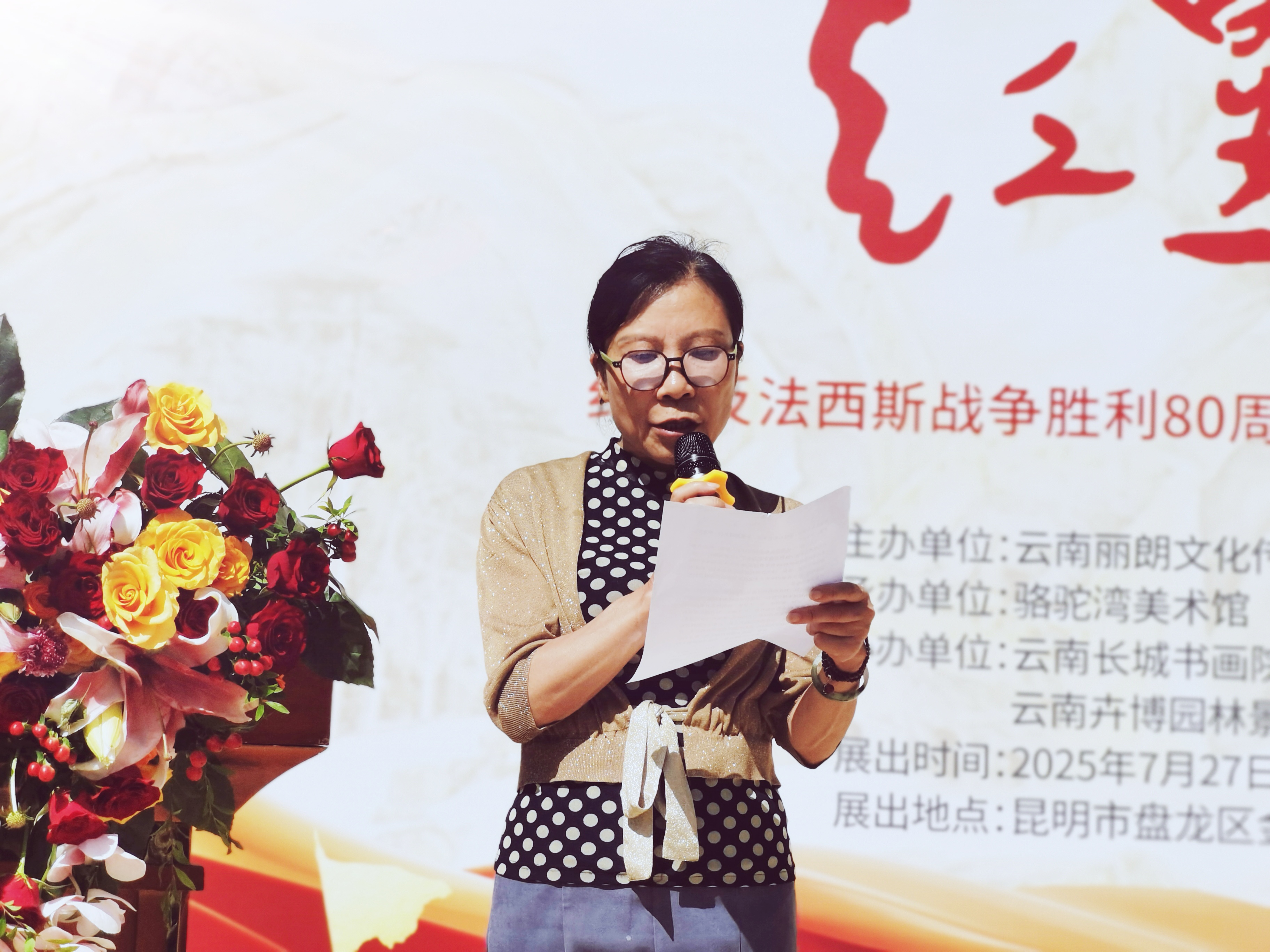 云南省文联原党组书记、主席郑明先生在致辞中,首先感谢了出身军人世家的李丽荣女士倾力承办此次意义非凡的画展。他高度评价了本次展览的高规格与独特价值,指出参展的七位将军和十一位书画家阵容强大,作品艺术水准卓越,其中钟开天、李如、于克敏等艺术家的多件作品曾荣获全国全军大奖。他强调,此展是为纪念世界反法西斯战争胜利80周年和中国人民解放军建军98周年而举办,旨在深情歌颂伟大祖国和人民军队,深切缅怀革命先烈,大力弘扬伟大的抗战精神,意义非凡。