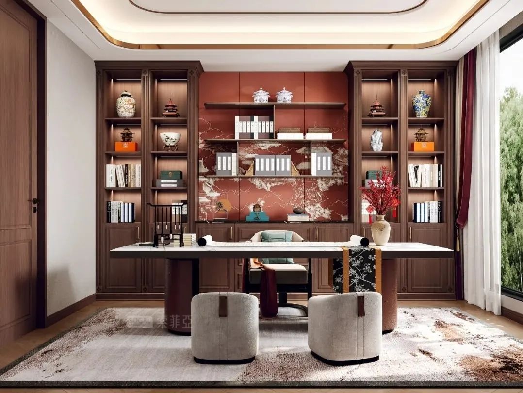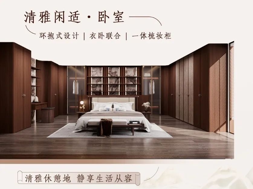 设计特点:深棕色仿实木纹搭配繁华图案;古韵色调营造东方雅致氛围;中式圆弧美学传达空间温润气质;原创画卷拉手点缀,丰富雅宅意境。