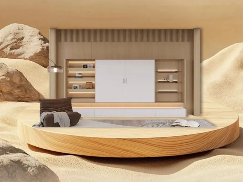 设计特点:空间造型陈列有序,稳固结构咬合;色彩采用轻柔的羊绒米灰+温润的原木色;材质呈现半透木皮质感、亲肤哑光羊绒米灰的光泽。