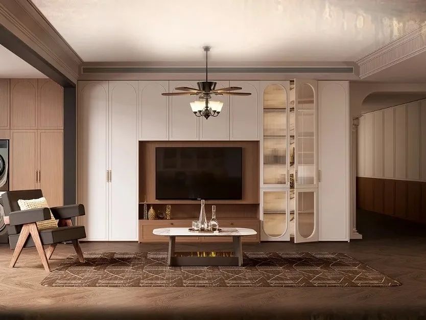 设计特点:客厅饱满圆润;餐厅门墙柜一体式,采用悬浮式设计/钢琴键装饰板,圆弧R角见光板柔化视觉突兀;卧室全空间定制,门墙柜、护墙同色。