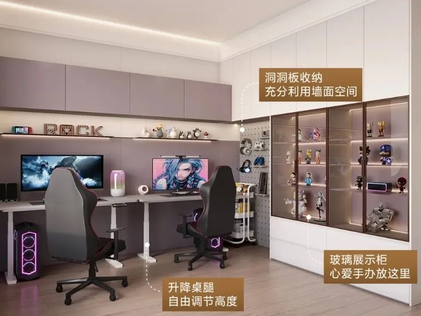 设计特点:多功能电竞房,集学玩、办公、收藏、休闲于一体;柜体榨取门后每寸收藏空间,三层分区精确匹配物品使用频率。
