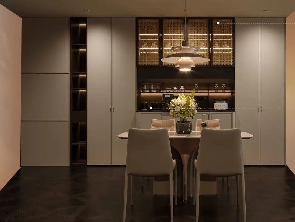 设计特点:客厅衔接客餐厅,置出休闲区,配备海棠角柜书籍收纳开放格;厨房践行极简主义,集成隐形收纳矩阵与动线操作岛台。