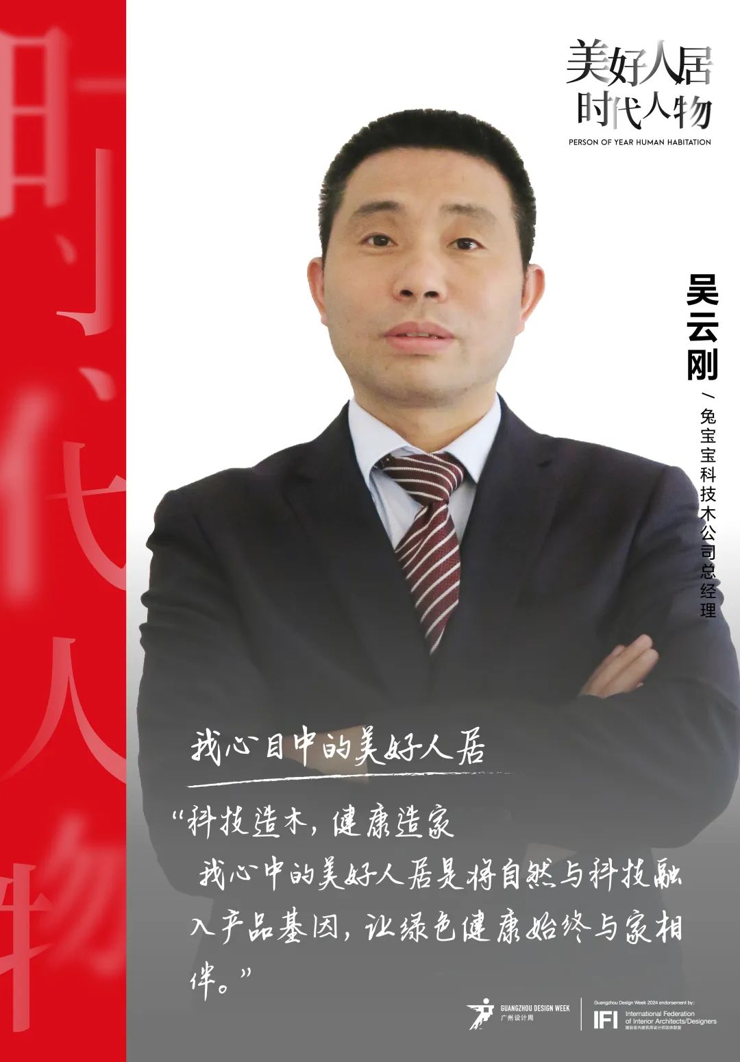 在“当代人居生活美学策源地”的发展愿景下,广州设计周携手家居新范式打造《美好人居时代人物》、《美好人居青年领袖》内容栏目,记录90+泛家居产业领军人物与先锋人物为满足人们对于美好人居生活的向往,而在材料技艺、空间业态、生活方式等方面所做出的策源创举和卓越贡献,深度探讨行业发展的新趋势、新未来、新模式。本期专访对话德华兔宝宝科技木公司总经理吴云刚先生,探究科技木如何造就绿色、环保、健康的家居生活。