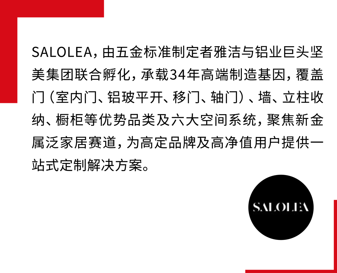 家居行业正从传统制造向智造”、单一产品向系统化解决方案升级,同时雅洁五金与坚美集团在五金、铝材领域具有深厚的技术积淀,其经验及资源尚未完全释放。基于这一洞察,我创立SALOLEA品牌,选择以新金属泛家居系统切入高端定制赛道,延续34年高端制造基因,迈出在高端家居领域“战略卡位”关键一步,把握行业未来发展方向,真正跨越行业周期。